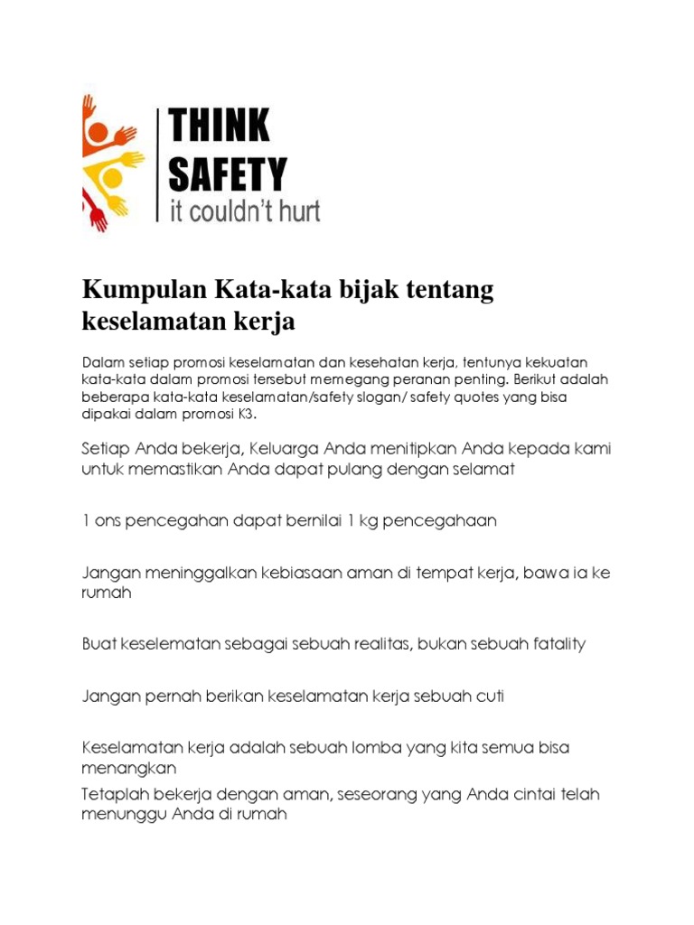 Kata-kata Bijak 1 sd 10 dari 37. Inilah kata kata mutiara safety dan ulasan lain mengenai hal-hal yang masih ada kaitannya dengan kata kata mutiara safety yang Anda cari. Mereka memang telah terbiasa mamnfaatkan internet di gadget untuk melihat informasi gambar untuk dijadikan ide.