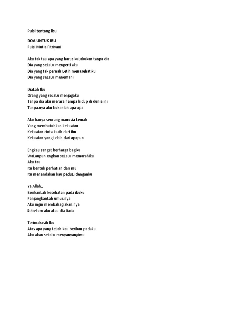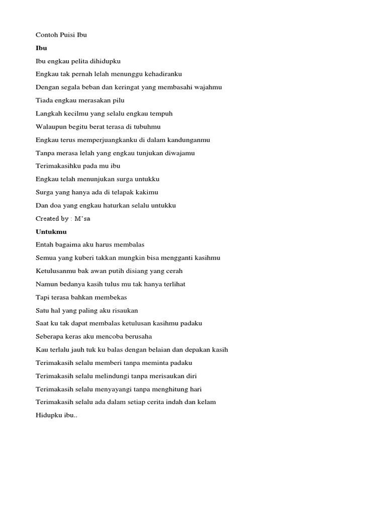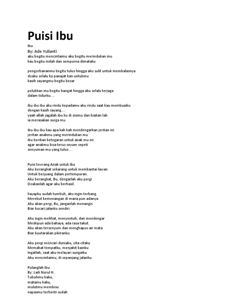 Semoga bait puisi ibu yang dibagikan dapat memberikan. Ananda Sulistya Ibu Kaulah pahlawanku Engkau yang mengandungku selama 9 bulan dan melahirkanku Dirimu yang membesarkanku hingga dewasa Ibu Engkau yang mendidikku Kasih sayangmu tak pernah kulupa Engkau pembimbing hidupku Hanya engkau yang ada dihatiku Oh ibu Kau bagai matahari yang selalu bersinar Kasih sayangmu tak terhingga. Kamu bisa menulis atau membaca puisi tentang ibu sebagai rasa syukur.