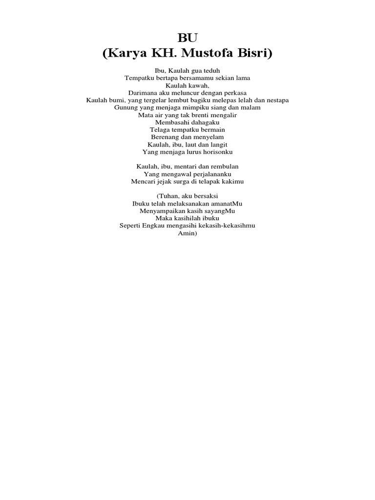 Puisi ibu engkau ibuku. Ibu Berbagai rintangan engkau hadapi Berbagai dugaan engkau tempuhi Tanpa mengelu. Ibuku Pengorbananmu sungguh suci Pengorbanan yang engkau beri Daripada hati yang murni Yang ikhlas untuk kami. Bahwa ibu bukan hanya tempat mengadu kesusahan saja namun juga tempat berbagi kebahagiaan.