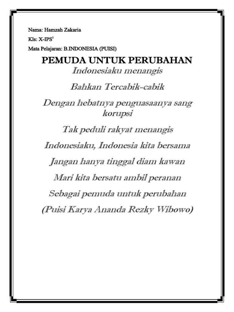 Puisi PEMUDA UNTUK PERUBAHAN Oleh Ananda Rezky Wibowo. Berjuta banyaknya untuk membela. Indonesia Menangis bahkan tercabik dengan hebatnya penguasanya korupsi tak peduli rakyatnya mengemis.