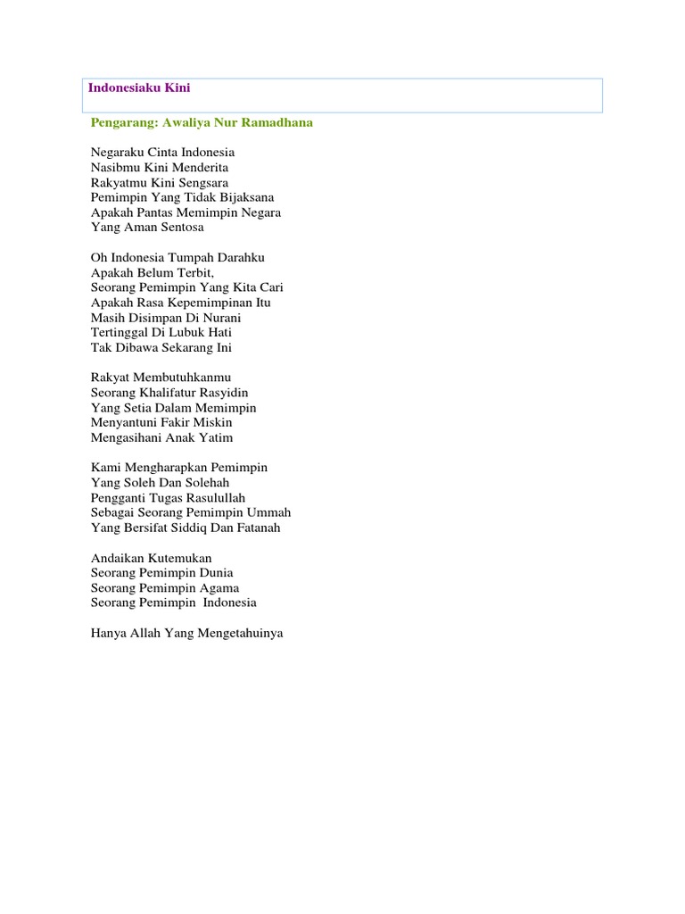 Aku kami kita dan mereka adalah generasi yang membangun mimpi di atas jeritan Ibu Pertiwi. Negaraku cinta indonesia Nasibmu kini menderita Rakyatmu kini sengsara Pemimpin yang tidak bijaksana Apakah pantas memimpin negara Yang aman sentosa Indonesiaku tumpah darahku Apakah belum bangun dan terjaga Pemimpin yang kita bangga Apakah rasa kepemimpinan itu Masih tersimpan di nurani Dan tertinggal di lubuk hati Rakyat membutuhkanmu Seorang khalifatur Rasyidin. Indonesiaku Tanah air yang ku banggakan Dibalik bendera merah putih itu Ada banyak tetesan darah yang tumpah.