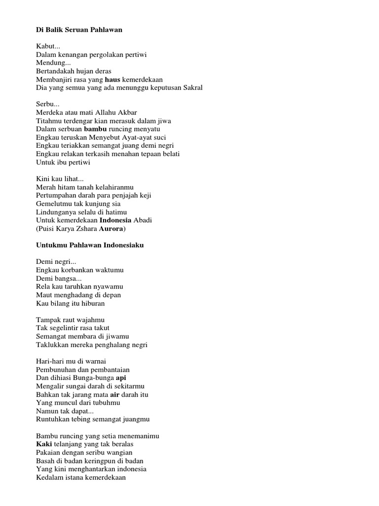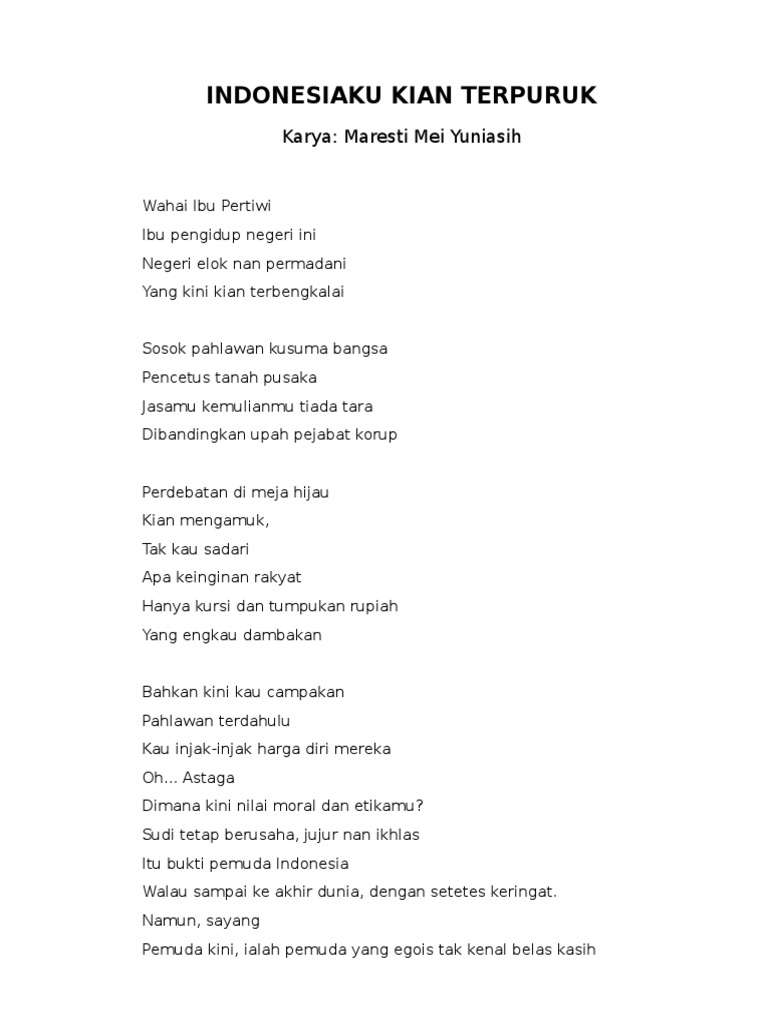 Puisi indonesiaku kini. Karenamu pahlawanku Sekarang bumi kami damai Air dan tanah menjadi kekayaan pertiwi Bukan eropa bukan juga belanda. Gunung-gunung saling berjejer tertata rapi. Karenamu pahlawanku Sekarang aku bisa hidup tenang Tanpa kerja rodi romusa Tanpa jerit takut rakyat tertembak.