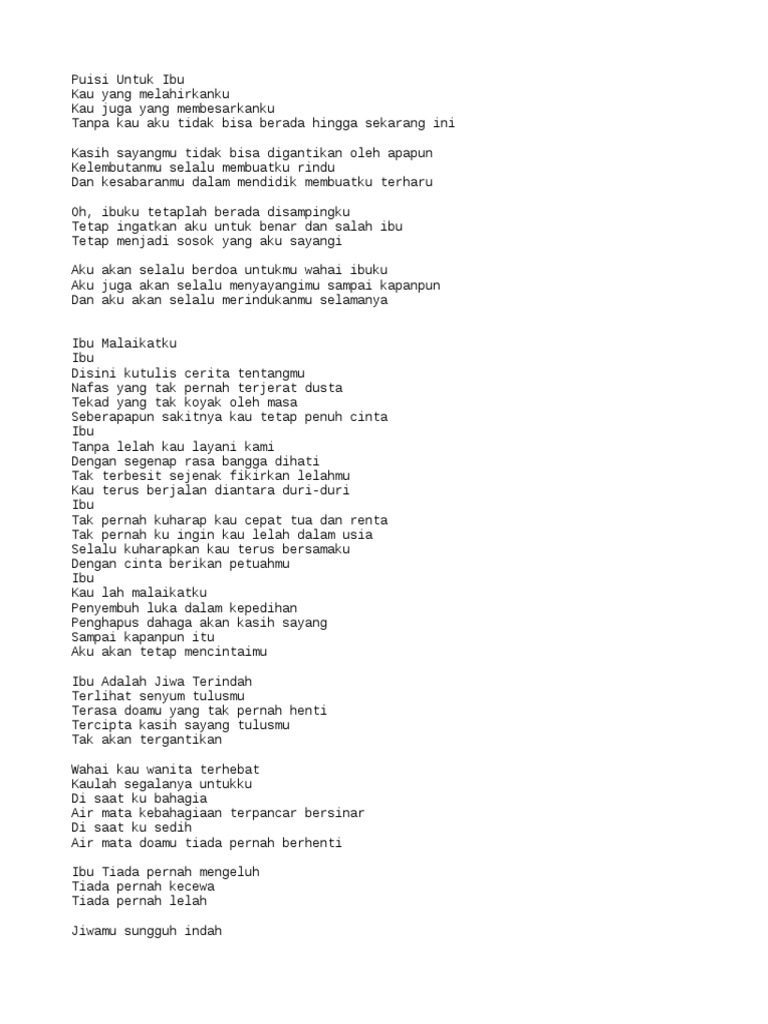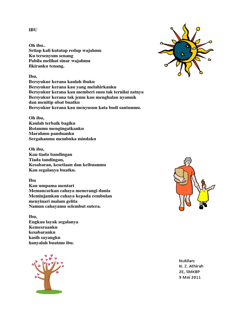 Kali ini contoh soalcoid akan membahas materi mengenai contoh puisi dimulai dari pendek pendidikan cinta sahabat ibu dan guru. SAJAK- Ibu Ku ciptakan sajak ini sebagai luahan kasih sayang buat ibuAku sedar aku tidak mampu menjaga ibu sepertimana ibu pernah memelihara aku dari kecil hingga aku dewasaNamun aku sedaya upaya menjalankan tanggungjawab aku meskipun aku tahu ianya tidak setimpal dengan budi dan jasa serta pengorbanan agungmu. Puisi Ibu Perjuangan seorang Ibu mulai dari mengandung melahirkan hingga merawat dan membesarkan kita dengan kasih sayang tidak dapat kita bayar dengan harta apapun.