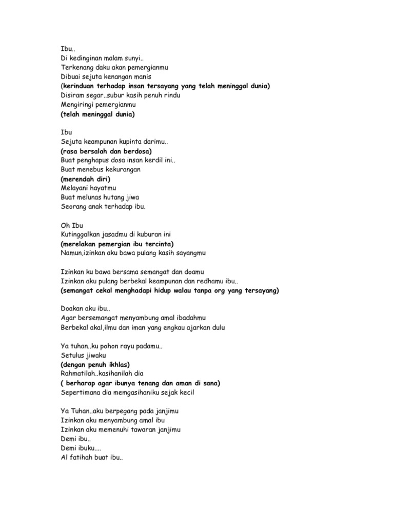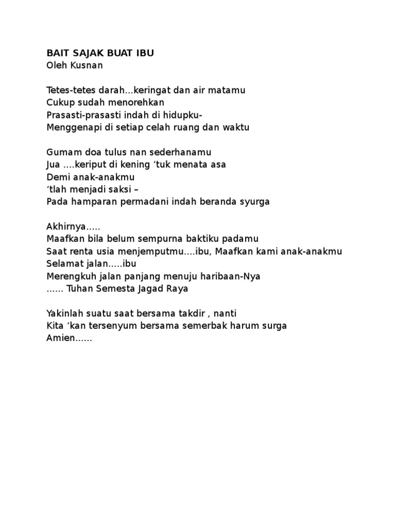 Ibu oh Ibu engkaulah Citra keagungan dan ketulusan hati Dalam mengasihi dan menyayangi Maka bersama doa restumu kami melangkah Menempuh perjalanan menyibak rintangan Menembus badai topan Menyongsong matahari harapan Menjadi manusia melia yang keberadaanya Membawa manfaat dan untaian makna. 15 Puisi Ibu Sedih MAAFKAN AKU IBU. Ibu Maruf Buchori Oh Ibu.