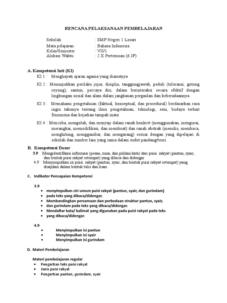 5 Rpp Kd 3 9 Dan 4 9 Puisi Rakyat Ks