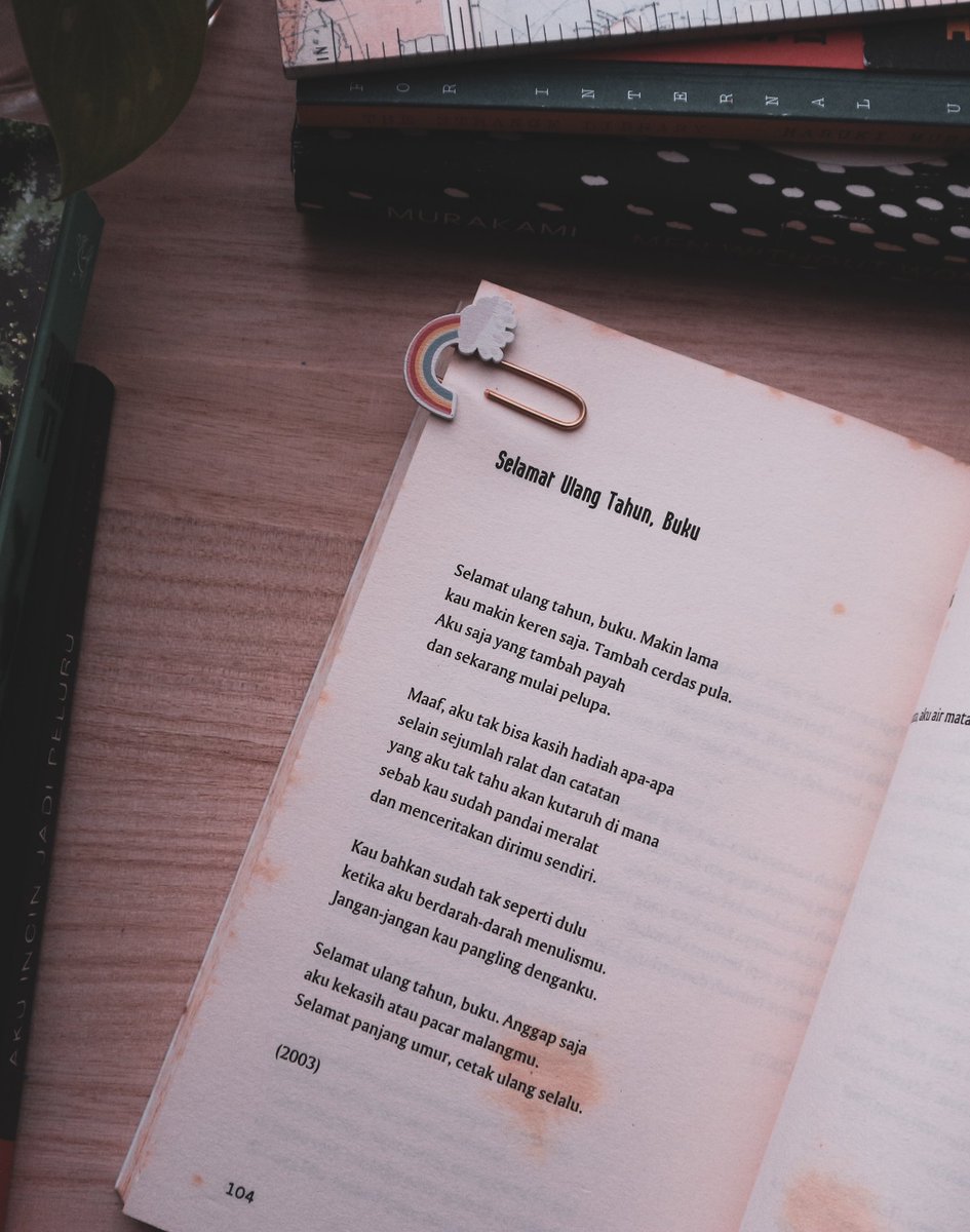 Sebab kau sudah pintar membaca dan meralat dirimu sendiri. Di tahun berikutnya 1987 sejumlah puisinya dimuat dalam antologi bersejarah perpuisian Indonesia modern yakni Tonggak terangkum empat jilid. Selamat ulang tahun buku.