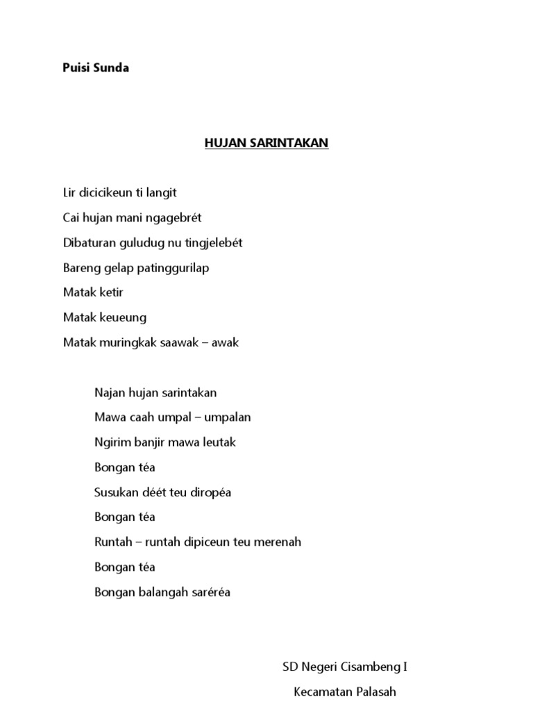 Edisi revisi Cetakan ke-1. Sajak ieu ditulis ku basa buhun kolot baheula anu tinangtos raos pami diregepkeun. Contoh puisi bahasa sunda puisi merupakan sebuah karya sastra tertulis yang dimana isinya ialah tuangan dari perasaan seorang penyair.