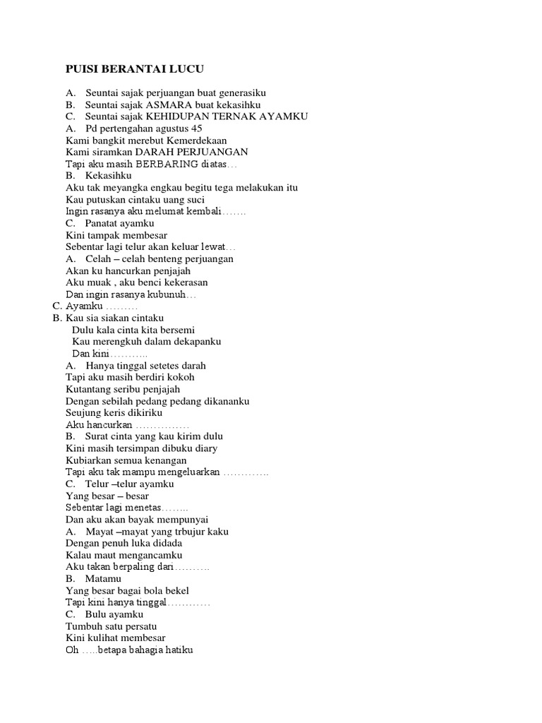 Kan aku cerdaskan bangsa untuk Indonesia tercinta. Pada dasarnya puisi berantai ini dapat dilakukan oleh 3 orang atau lebih. Pecinta Pejuang Dan Penjual Telur Pecinta.