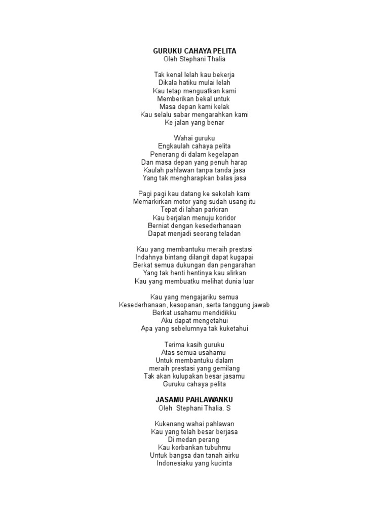 Dapatkah kuulangi Dengan huruf dan suku kata lain. Yang selalu mengajari untuk berbagi Yang selalu mengajari untuk sesama yang membutuhkan Guruku layaknya pelangi. Guru adalah sosok yang sangat berjasa bagi bangsa.