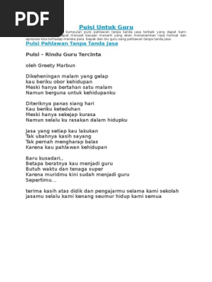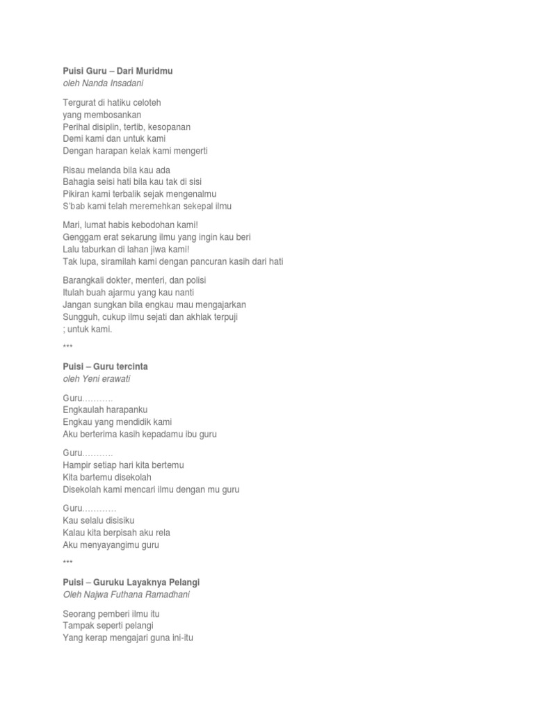Kumpulan Puisi Spesial Untuk Guru Kamu. Empat huruf dua suku kata Guru. Teruntuk guruku Kau bagaikan pelita di hatiku Kau menerangi kehidupanku Dengan semua sikap tulusmu.
