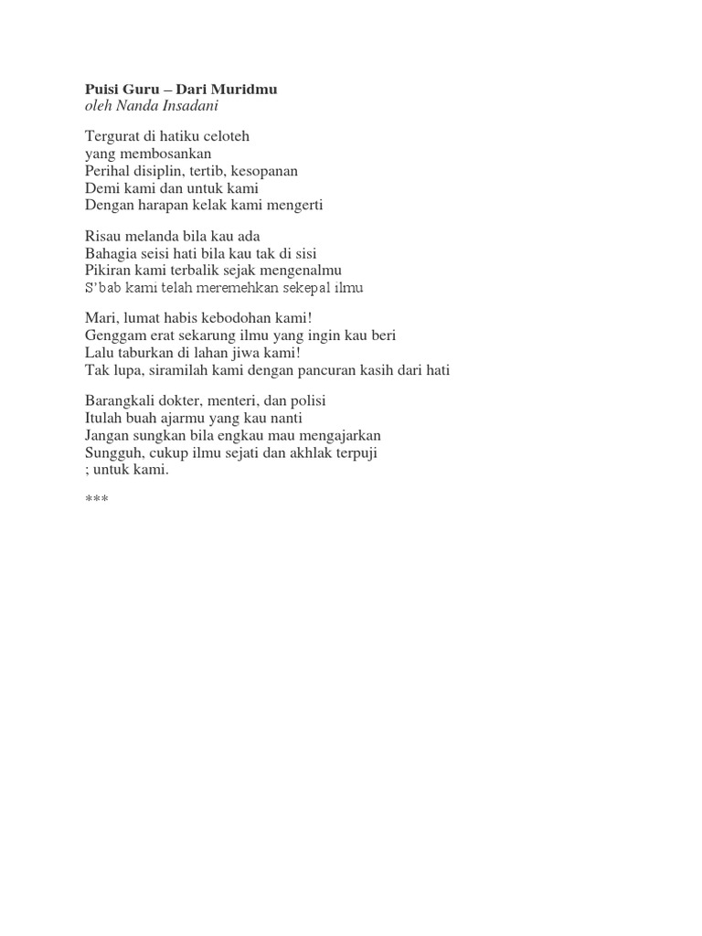 Empat huruf dua suku kata Guru. PUISI UNTUK GURU TERSAYANG dari blog ae kadal dengan judul PUISI UNTUK GURU TERSAYANG. Menjemput sang pelangi mengantarkannya meraih mimpi demi ibu pertiwi.