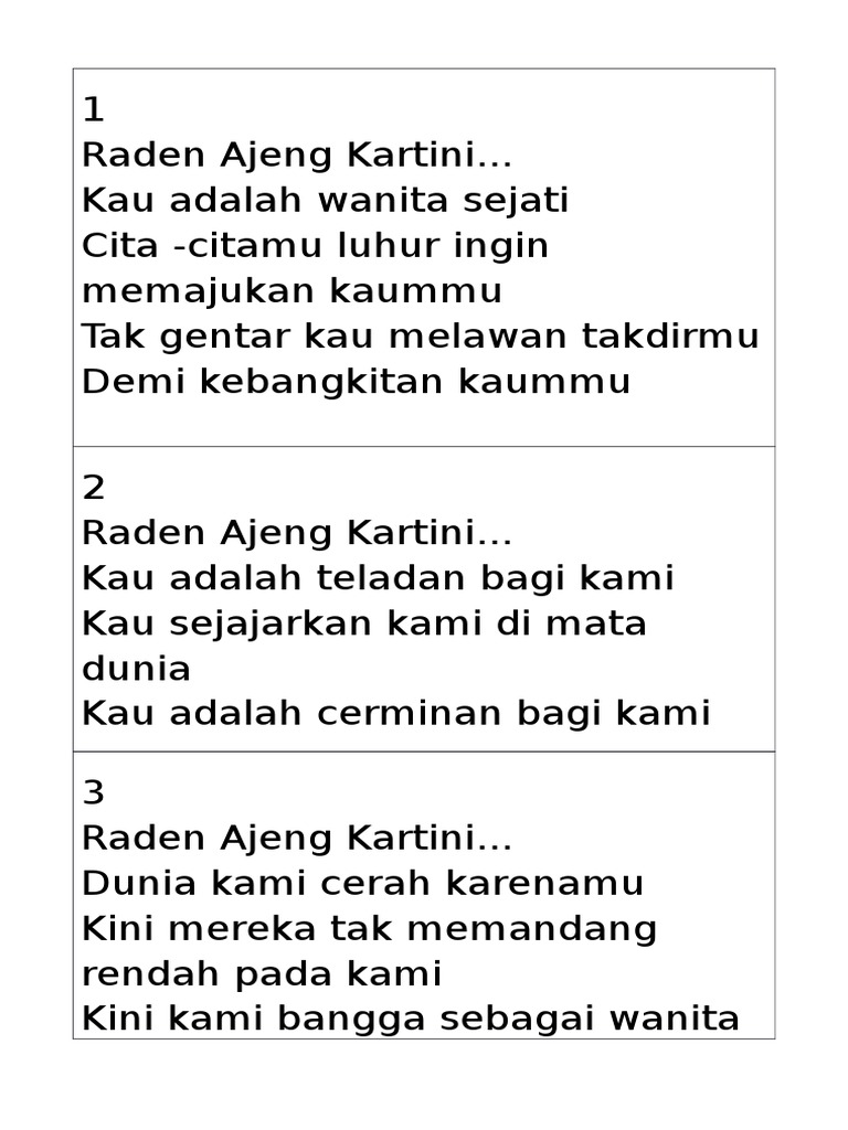 Ibu Kartini Meski kau telah tiada Namun semangat dan perjuanganmu Masih menyemangati kaum hawa di seluruh nusantara. Namun hingga saat ini semangat dan pengabdiannya diteruskan oleh beberapa pejuang hak dan kesetaraan perempuan lainnya. Telah terpatri Namamu dalam lubuk jiwa Para perempuan Indonesia.