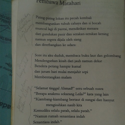 Bulan tak ingin membawa tertawa manja Kala waktu enggan berkawan pada hari Saat bintang bersembunyi sunyi sendiri Terhapus awan gelap melahap habis langit. Kutitipkan salam pada angin laut untuk seseorang di seberang sana Kepada ombak kukatakan detak jantungku Di bawah langit yang sama menari-nari. Pada saat membacakan atau mendengarkan larik-larik puisi kita dapat menemukan diksi yang dapat dirasakan kulit misalnya dingin panas lembut kasar dan sebagainyaDalam kumpulan puisi Pembawa Matahari terdapat beberapa citra perabaan yaitu menemukan diksi yang berhubungan dengan perabaan.