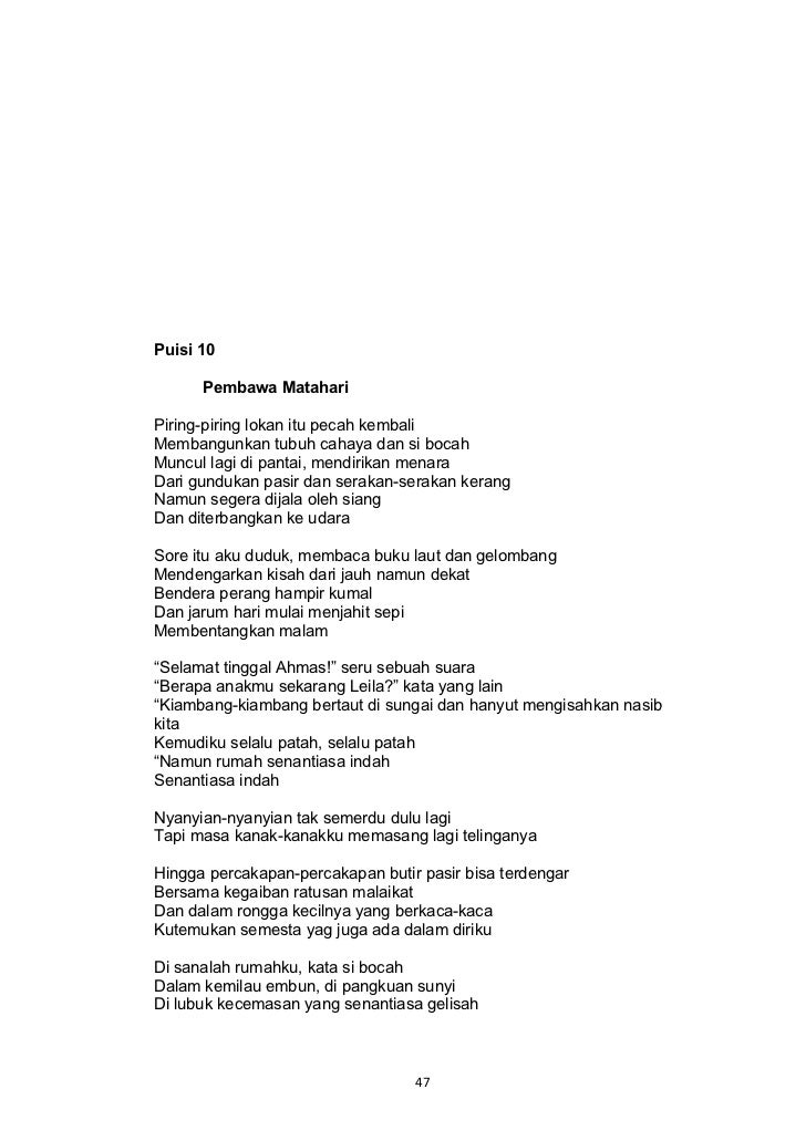 Bulan memudar cantik menarik pada jiwa ini Hitam memang menang menyerang terang Tetapi mekar fajar Bersama mentari akan menari Bersama untaian senandung salam alam pagi. Kemanusiaan yang dimaksudkan lebih condong atau. Pada saat membacakan atau mendengarkan larik-larik puisi kita dapat menemukan diksi yang dapat dirasakan kulit misalnya dingin panas lembut kasar dan sebagainyaDalam kumpulan puisi Pembawa Matahari terdapat beberapa citra perabaan yaitu menemukan diksi yang berhubungan dengan perabaan.