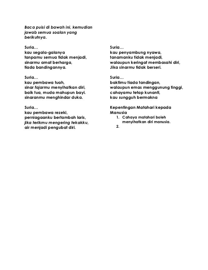 Puisi pembawa matahari. Puisi Sajak Matahari merupakam puisi yang bertemakan kemanusiaan. Ketika hujan datang silih berganti. Matahari telah membuat Bumi ini hangat dan hidup.