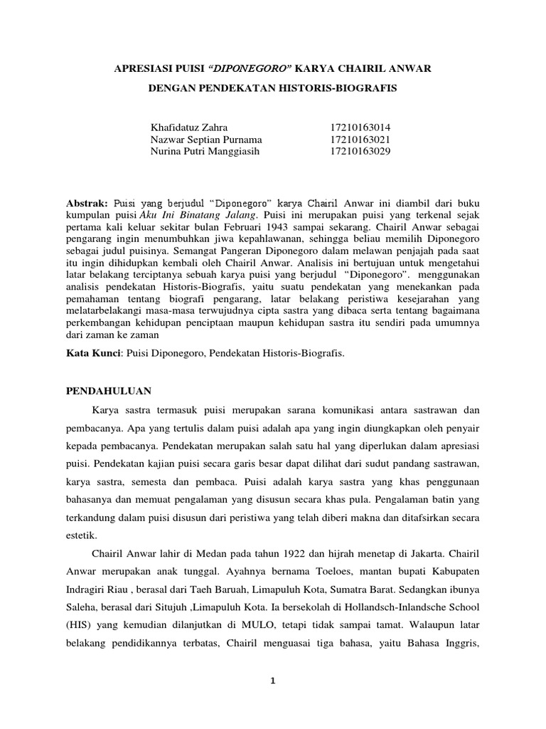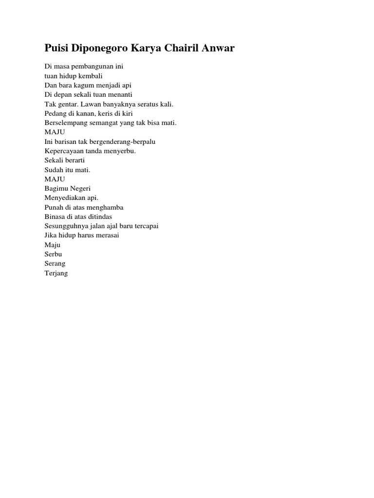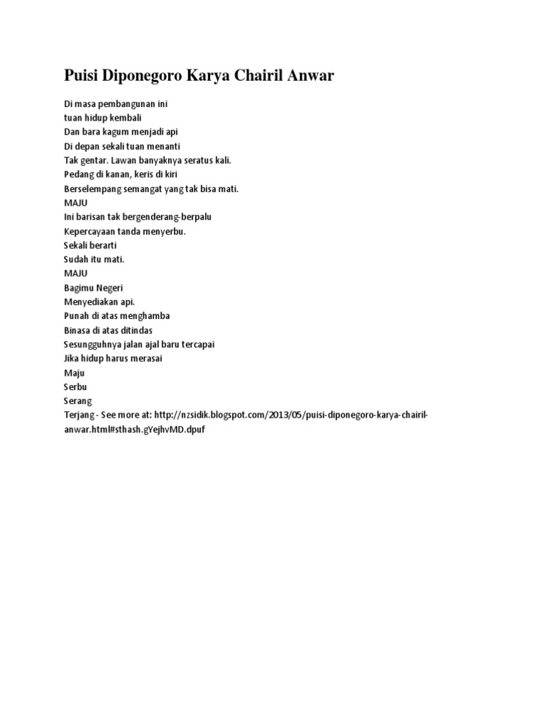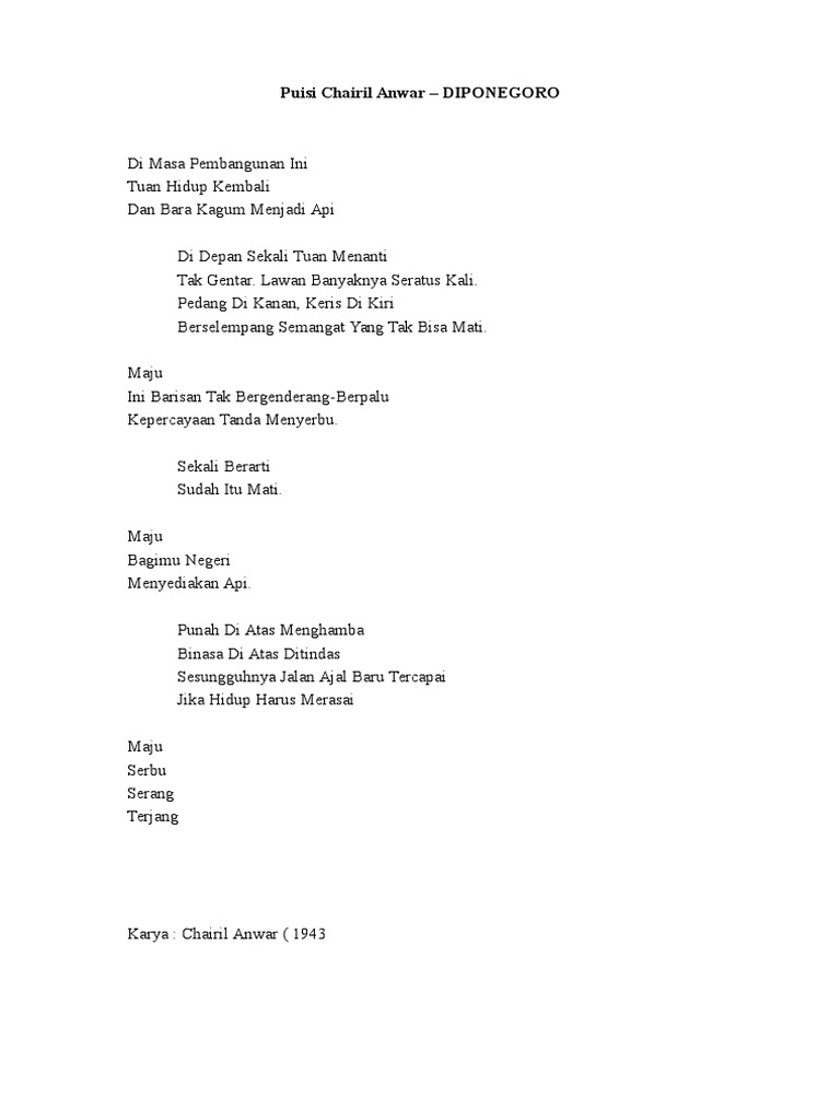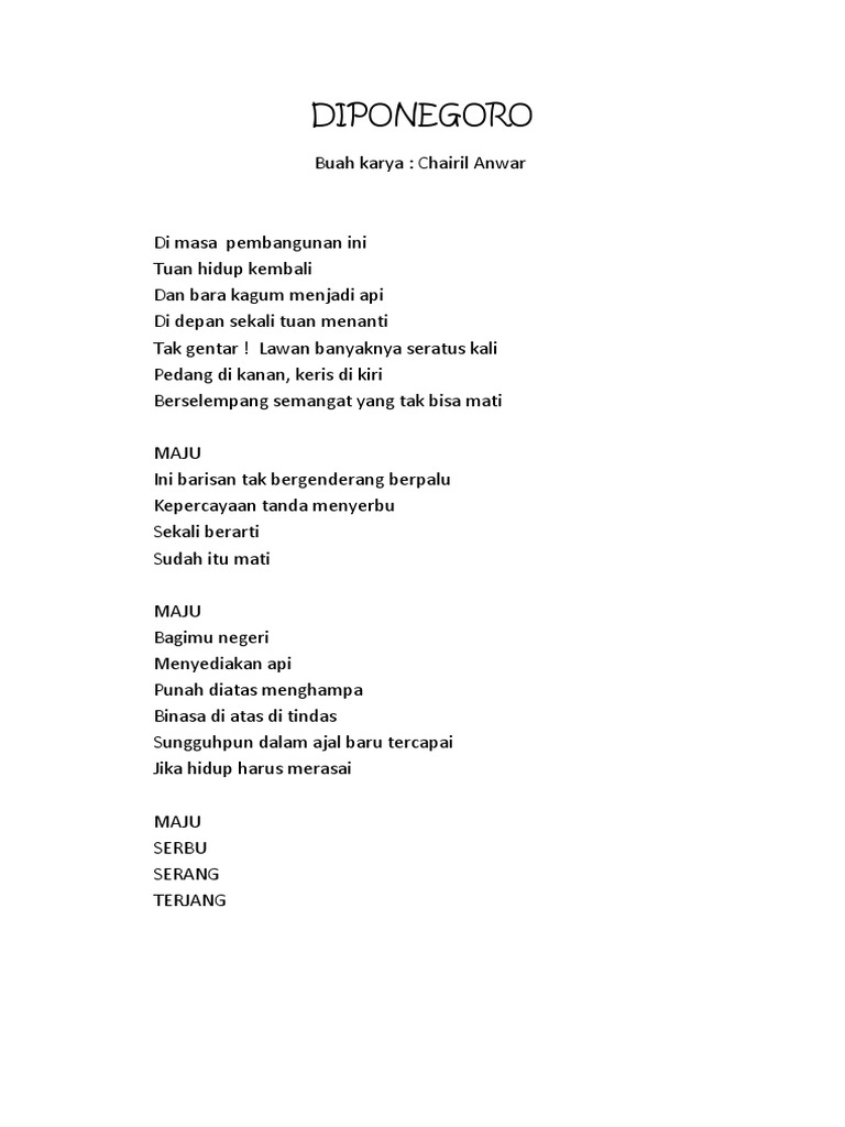 Langsung aja ngak pake lama mudah2an tidak repost dan salahkamar Ane mau share mengenai 13 Puisi Terbaik Chairil Anwar sepanjang masa. Isi Babad Diponegoro itu Carey menambahkan semacam puisi yang tebalnya 1170 halaman folio. Pangeran Diponegoro maju tak gentar walaupun musuh berjumlah ratusan kali.