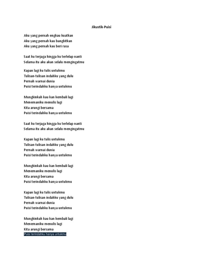 Puisi Terindahku Hanya Untukmu. Pernah warnai dunia Selama itu aku akan selalu mengingatmu Kapan lagi ku tulis untukmu Tulisan-tulisan indahku yang. Lagu Puisi Jikustik bisa dinyanyikan ulang menggunakan gitar.